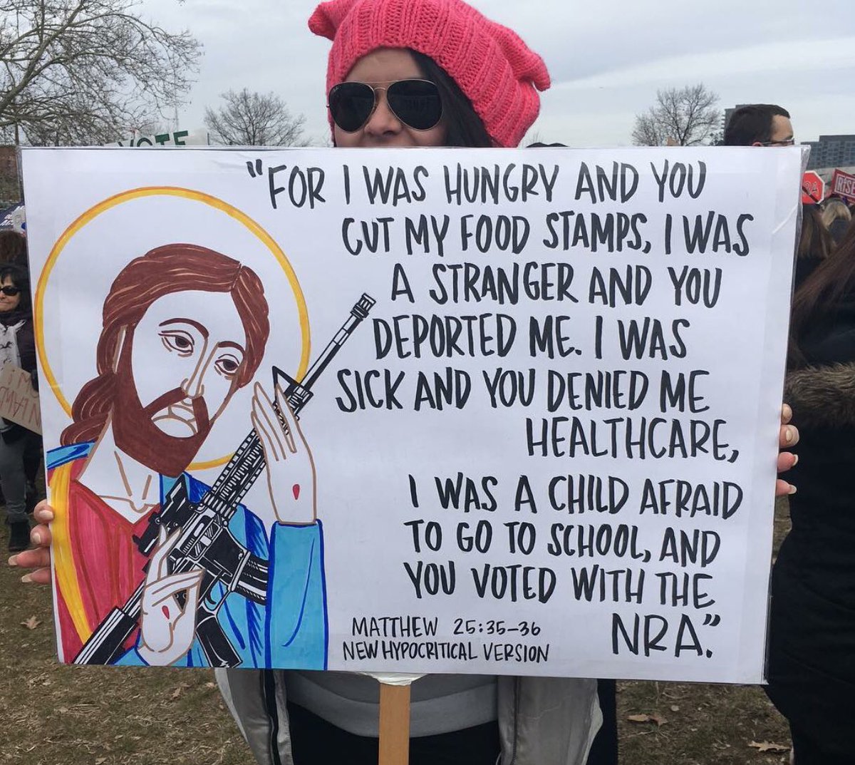 - «Eu tinha fome e cortaste-me o subsídio de alimentação; eu era um estrangeiro e deportaste-me; eu estava doente e negaste-me cuidados de saúde; eu era uma criança que tinha medo de ir para a escola e tu votaste ao lado da Associação Nacional das Espingardas.»
